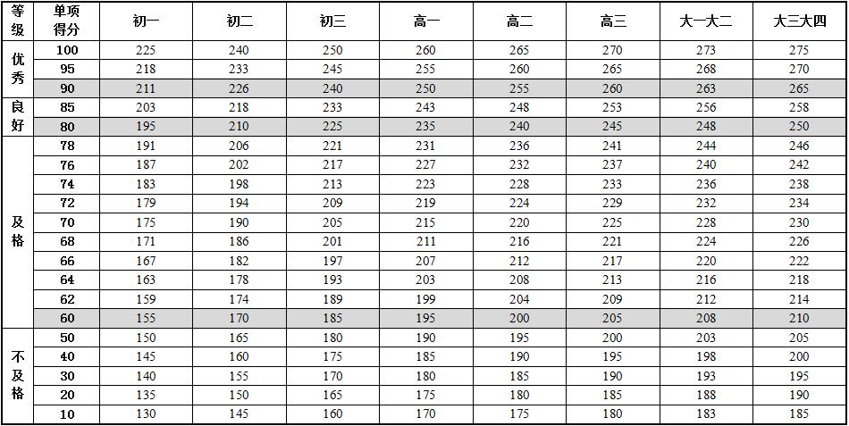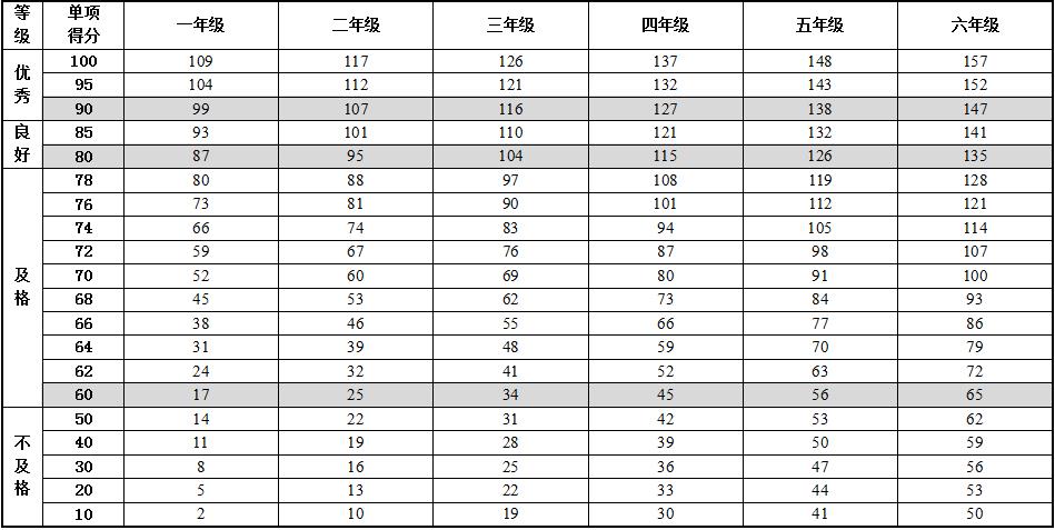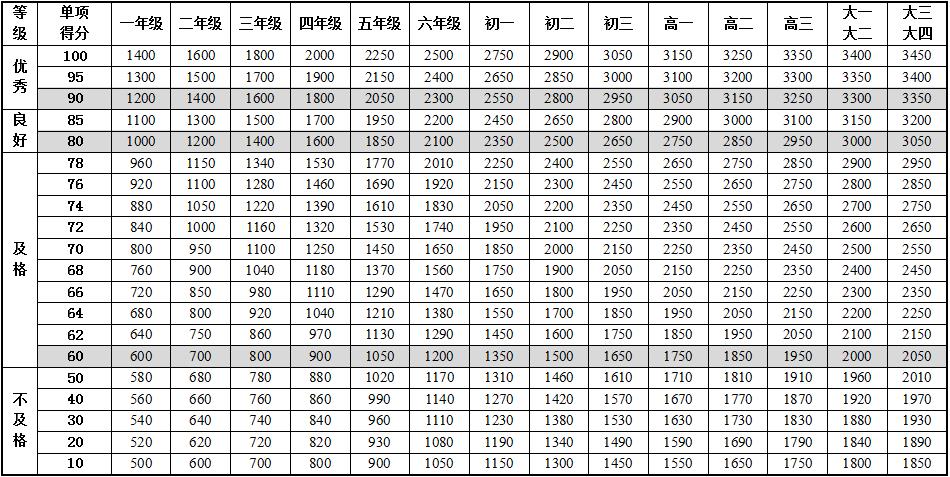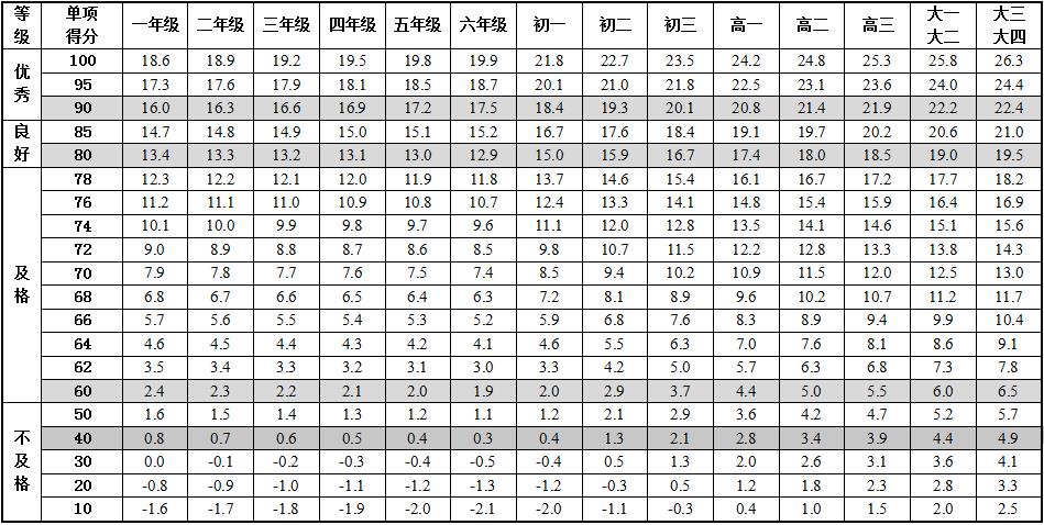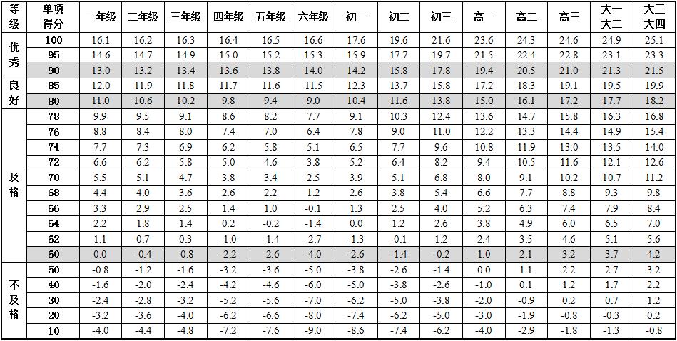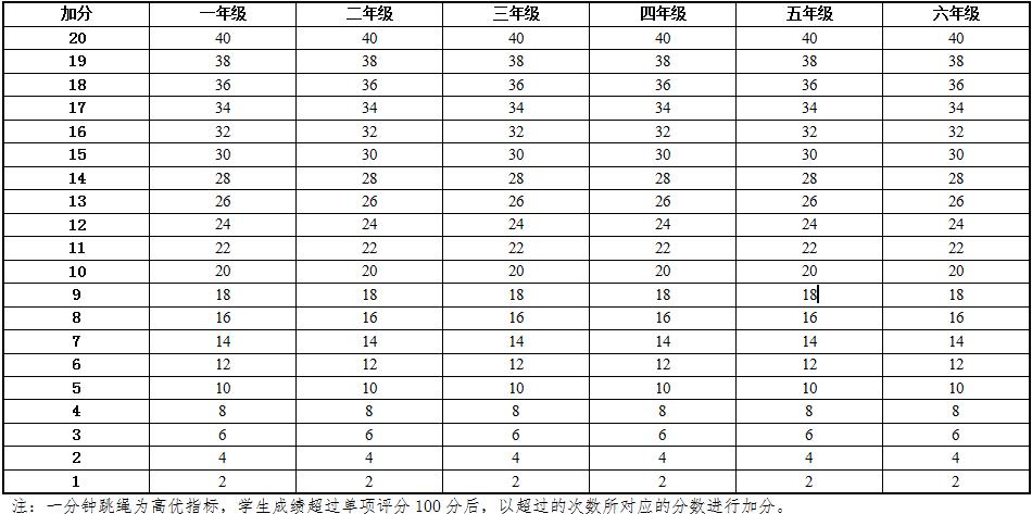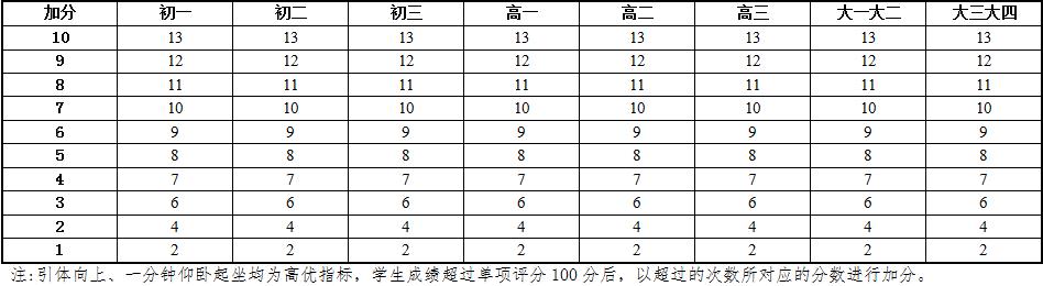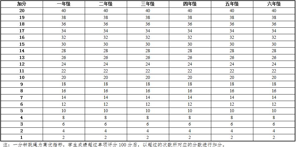 6.本标准的学年总分由标准分与附加分之和构成,满分为120分。标准分由各单项指标得分与权重乘积之和组成,满分为100分。附加分根据实测成绩确定,即对成绩超过100分的加分指标进行加分,满分为20分;小学的加分指标为1分钟跳绳,加分幅度为20分;初中、高中和大学的加分指标为男生引体向上和1000米跑,女生1分钟仰卧起坐和800米跑,各指标加分幅度均为10分。