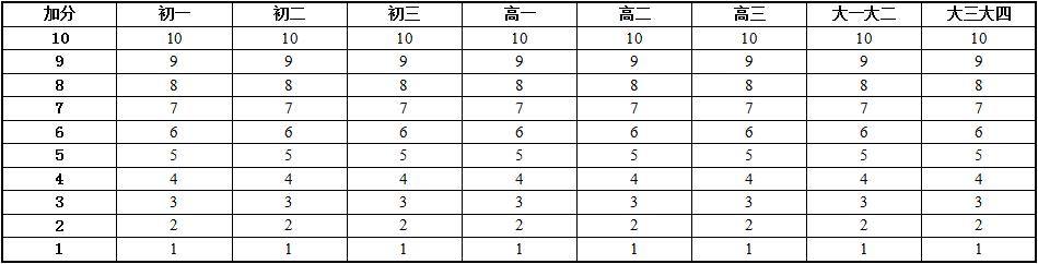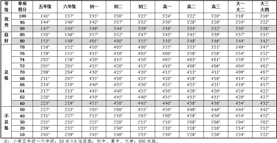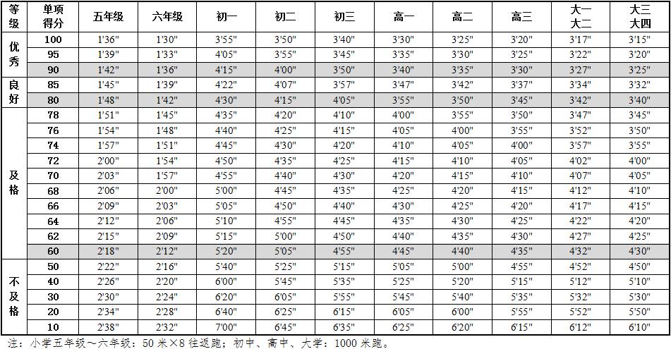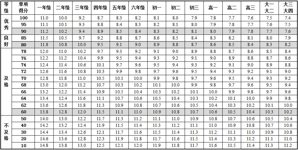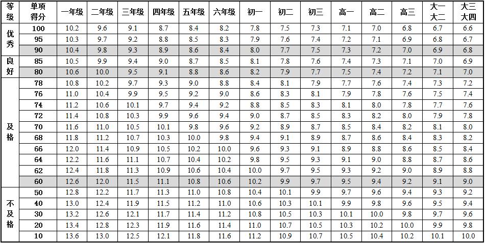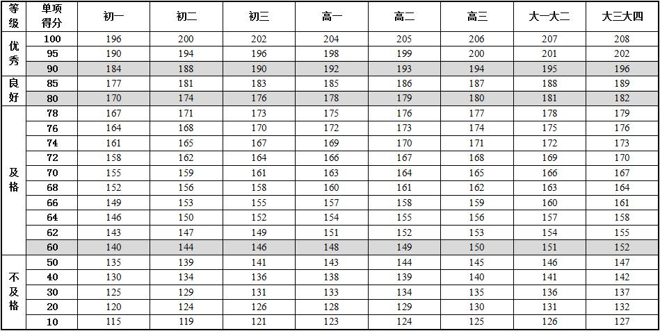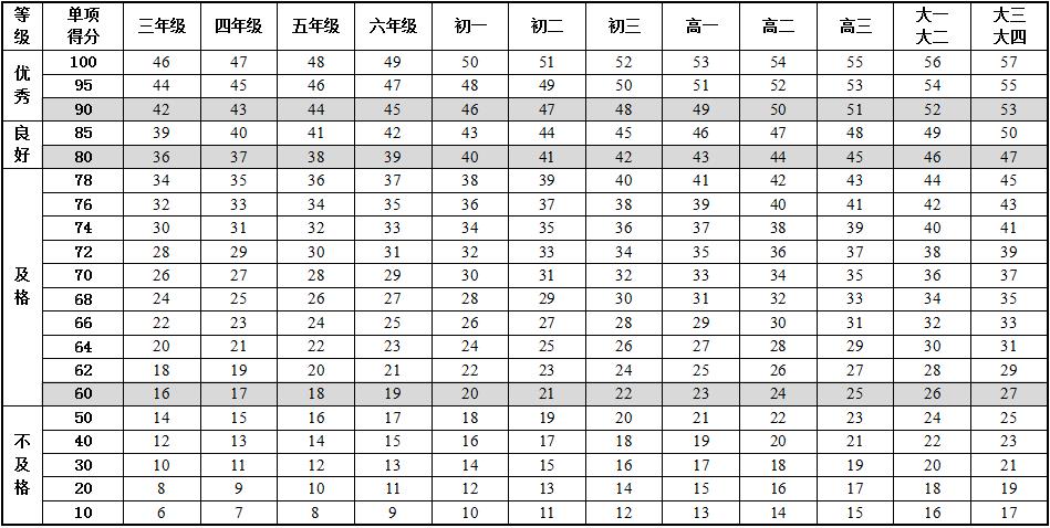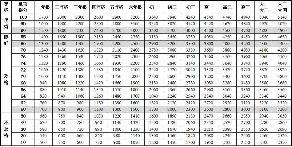 6.本标准的学年总分由标准分与附加分之和构成,满分为120分。标准分由各单项指标得分与权重乘积之和组成,满分为100分。附加分根据实测成绩确定,即对成绩超过100分的加分指标进行加分,满分为20分;小学的加分指标为1分钟跳绳,加分幅度为20分;初中、高中和大学的加分指标为男生引体向上和1000米跑,女生1分钟仰卧起坐和800米跑,各指标加分幅度均为10分。