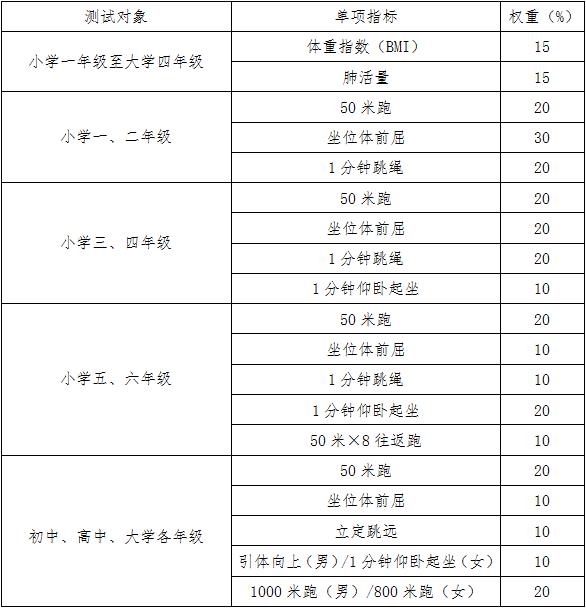 5.小学、初中、高中、大学各组别的测试指标均为必测指标。其中,身体形态类中的身高、体重,身体机能类中的肺活量,以及身体素质类中的50米跑、坐位体前屈为各年级学生共性指标。