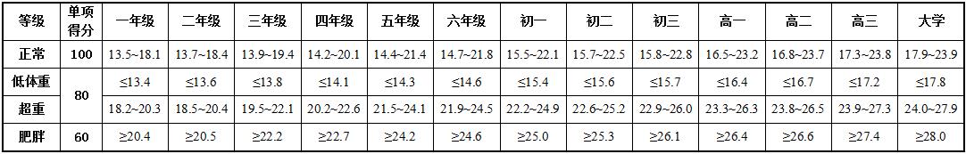 表1-1 男生体重指数(BMI)单项评分表(单位:千克/米2)