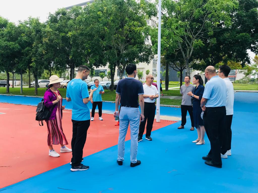 阳江校区工作专班负责人洪鹏志委托校区基础部徐常威主任及体育教研室三位老师引导大家参观了阳江校区的田径场、体育馆、篮球场等基础设施,大家与此同时进行了广泛的交流。