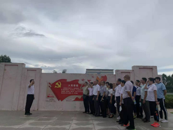 在史馆广场左前侧入党宣誓台上,参加活动的全体党员佩戴党员徽章、整齐列队,面对鲜红的党旗、高举右拳,在李新华书记的领誓下重温入党誓词,表达了永远听党话,坚定跟党走的信心和决心。
