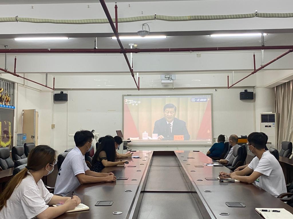 2022年5月10日上午,学院领导组织全体学工人员、部分学生骨干在湖光校区体育馆109会议室现场观看庆祝中国共产主义青年团成立100周年大会实况直播。