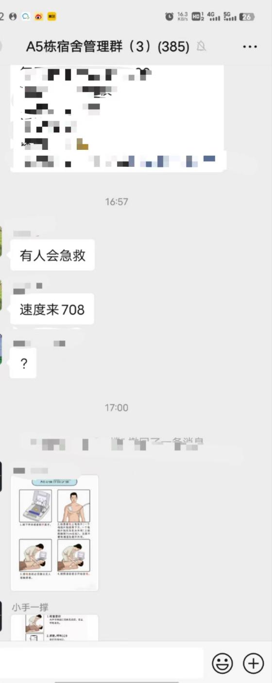2024年9月27日下午,广州大学城广州大学A5栋宿舍楼的微信群中,突发一条紧急呼救信息:“有人会急救?速度来708!”此刻,正在附近运动场进行锻炼的2022级研究生陆晓祺同学(原磁力猫
